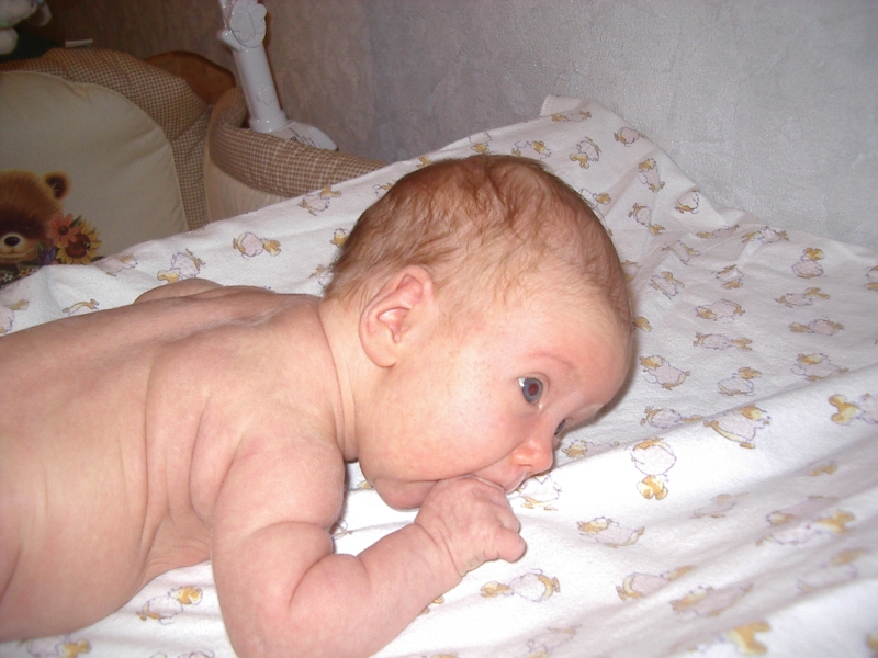 Пытаюсь поднять голову с пальцем во рту.
