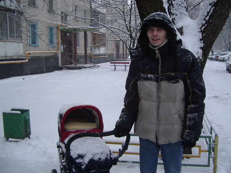 Сейчас устрою расчистку коляски от сугроба.