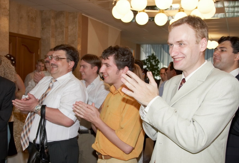 Молодоженов встречают аплодисментами.